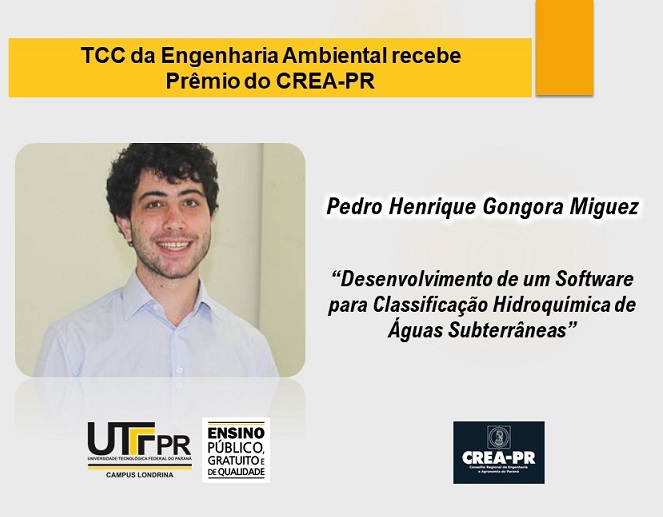 O mestrando Pedro Henrique Gongora Miguez, do Programa de Pós-Graduação em Engenharia Ambiental (PPGEA), da UTFPR campus Apucarana / Londrina , e também egresso do curso de Engenharia Ambiental (campus Londrina), teve seu TCC premiado em 2ª lugar do Estado na categoria de Engenharia Civil, do Prêmio Melhores TCCs do CREA-PR.
