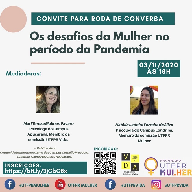 Na próxima terça-feira, dia 03 de novembro, às 18h, o Programa UTFPR Mulher e a Comissão UTFPR Vida, promovem a roda de conversa “Os desafios da mulher no período da pandemia”, pela plataforma Google Meet. O evento visa propiciar um bate papo descontraído acerca das dificuldades encontradas pelas mulheres neste período em que sua jornada de trabalho teve que ser incorporada aos seus afazeres da casa e com a família.