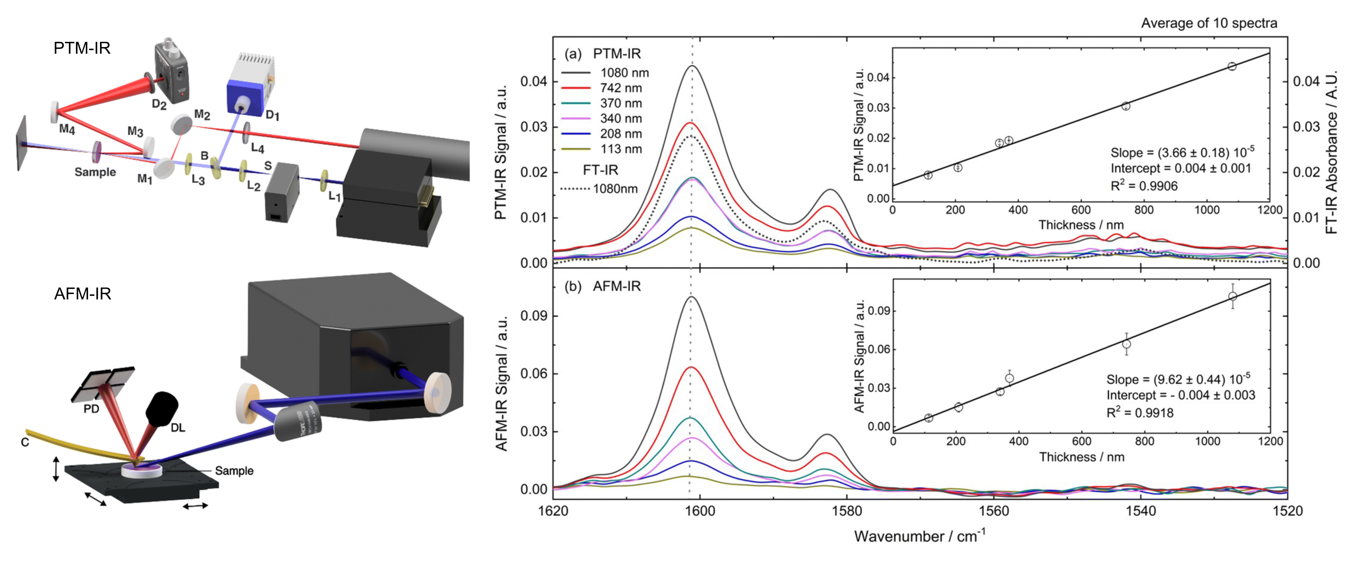 Publicado na RSC Advances da Sociedade Científica do Reino Unido, Royal Sociedade of Chemistry (RSC), o trabalho com o título "Novel insights into nanoscale surface displacement detection in polystyrene thin films using photothermal mirror- and atomic force microscopy-mid-IR spectroscopy" apresenta uma nova técnica para a análise química de filmes finos com espessura nanométrica depositado sobre um substrato transparente. Uma vantagem notável do método proposto, denominado espectroscopia de espelho fototérmico no infravermelho médio (PTM-IR), é a capacidade de detectar remotamente mudanças sutis na absorção óptica e deformação superficial, tornando o método altamente sensível e uma ferramenta valiosa para caracterização in situ de filmes finos, onde medições rápidas e sem contato são necessárias.