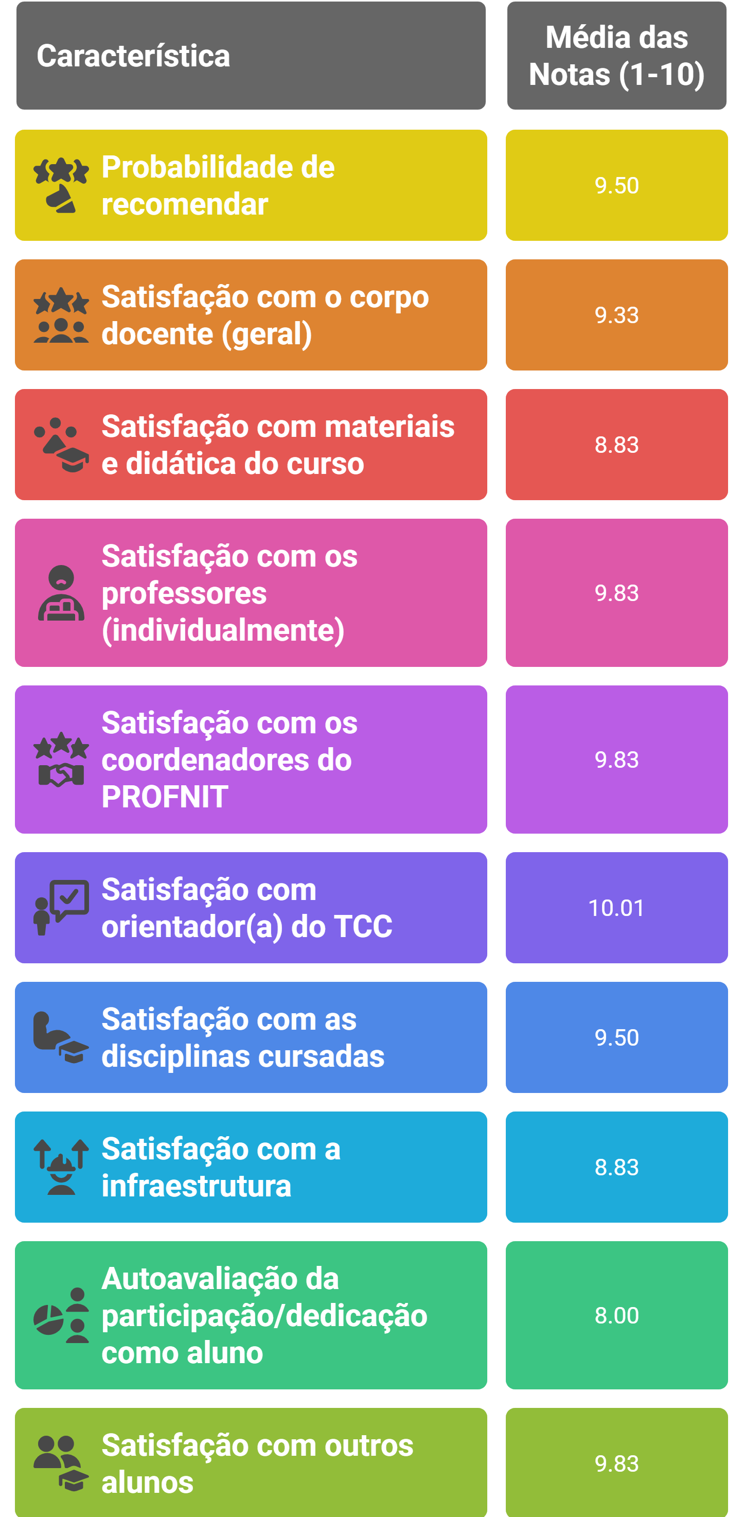 Um dos maiores destaques, comum a ambos os públicos, foi a avaliação excepcional da coordenação local do PROFNIT na UTFPR. Os coordenadores foram descritos como extremamente comprometidos, disponíveis e empenhados, recebendo a nota média de 9.88 (em uma escala de 1 a 10) dos professores e 9.83 dos alunos. Essa sintonia entre a gestão e a comunidade acadêmica é um pilar para o sucesso do programa.
