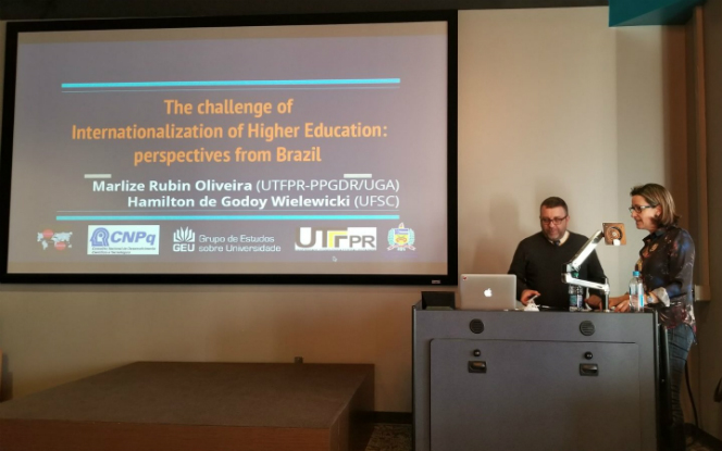 No dia 08 de fevereiro, a professora do departamento acadêmico de Ciências Humanas (DAHUM) e do Programa de Pós-Graduação em Desenvolvimento Regional (PPGDR), da UTFPR – Câmpus Pato Branco , Marlize Rubin Oliveira, que encontra-se afastada para pós-doutoramento nos Estados Unidos, apresentou em conjunto com o professor Hamilton de Godoy Wielewicki, da Universidade Federal de Santa Catarina (UFSC), alguns dos resultados do projeto "Desafios da Internacionalização da Educação Superior Brasileira: universidades de classe mundial”, em evento realizado na Universidade da Georgia (UGA), nos Estados Unidos (EUA). O projeto coordenado pela professora Marlize é financiado pelo CNPq, e foi contemplado por meio do Edital Universal 2014.