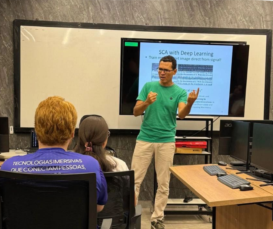Durante a visita, o docente participou de atividades acadêmicas e técnicas, incluindo o conhecimento da infraestrutura do INF/UFG e dos projetos conduzidos pelo grupo de pesquisa local, com destaque para o projeto “SEMA – Sensoriamento Multimodal Avançado”. No segundo dia, o professor ministrou uma palestra sobre vulnerabilidades em interfaces públicas de votação eletrônica, abordando riscos relacionados à quebra do sigilo do voto a partir da análise de vazamentos eletromagnéticos. A programação incluiu ainda uma demonstração técnica com o uso de rádios definidos por software, aplicada à interface da urna eletrônica brasileira.