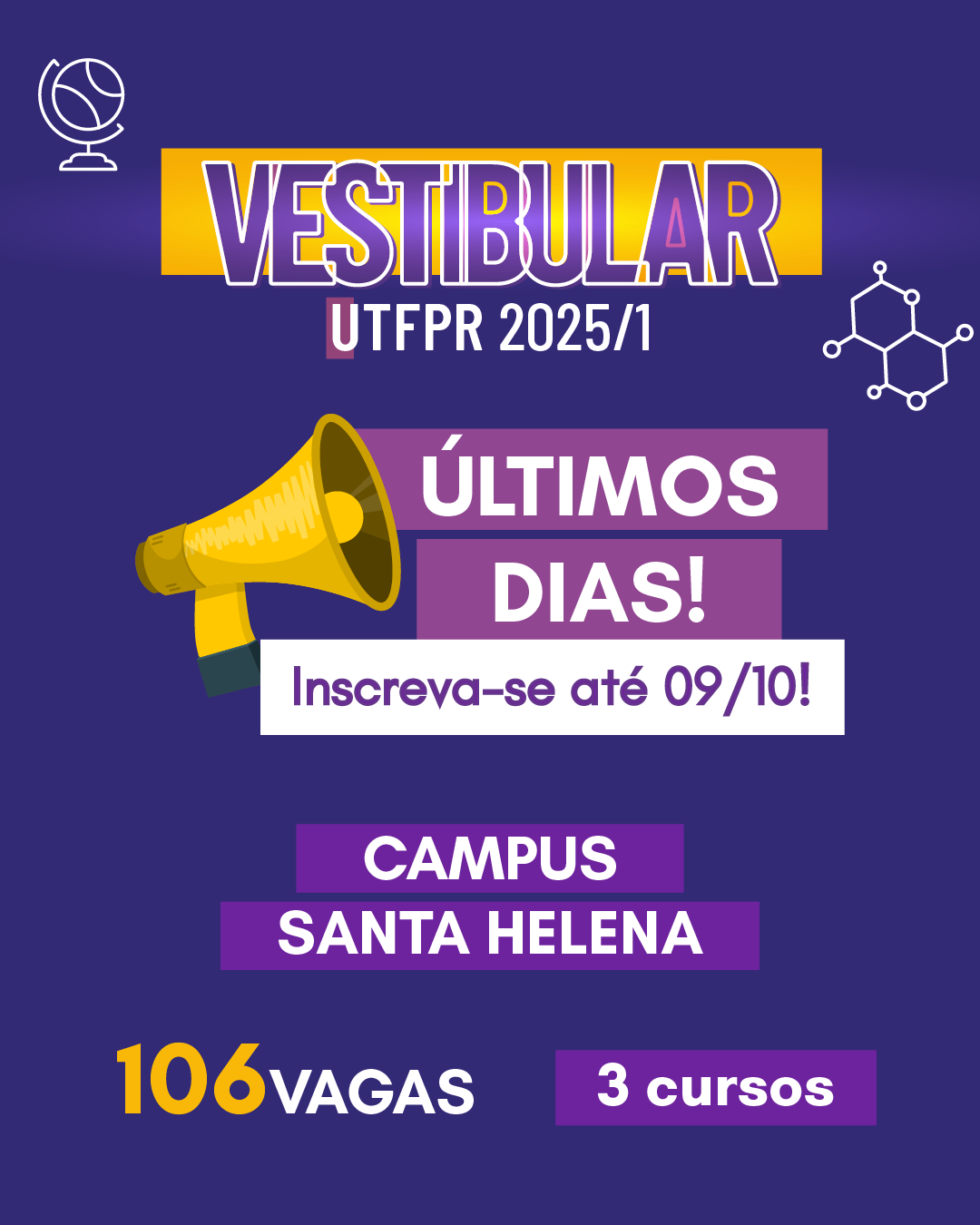 As inscrições para o Vestibular UTFPR se encerram nesta quarta-feira, dia 09 de outubro. A edição de Verão oferta 3.934 vagas em 117 cursos de graduação, integralmente gratuitos, com ingresso no primeiro período letivo do próximo ano (2025/1).