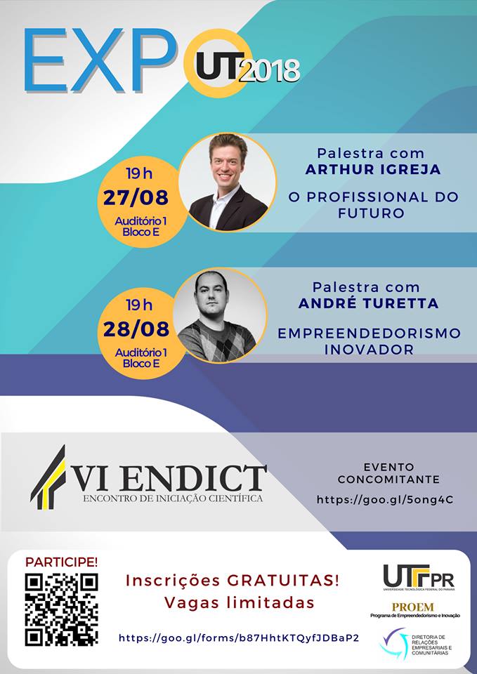 Neste ano, a VI ExpoUT acontecerá nos dias 27, 28 e 29 de agosto e, concomitante ao evento, ocorrerá o VI Encontro de Iniciação Científica (ENDICT), o UTF pelo mundo e o IV Workshop de Empreendedorismo e Inovação.