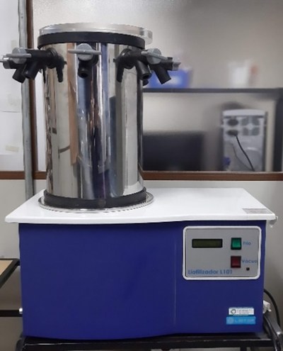 Descritivo sucinto: Sistema de liofilização completo contendo liofilizador com unidade condensadora construída em aço inox, capacidade para até 3,0 L de gelo.