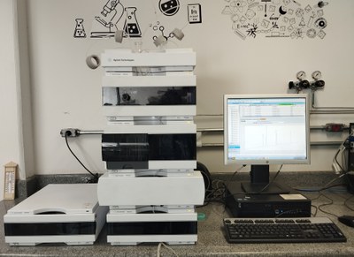Principais características: sistema que permite análise de substâncias orgânicas em geral, em amostras líquidas ou extraídas, com a finalidade de identificar a presença, determinar a concentração ou realizar a purificação e isolamento de substâncias; é composto pelas seguintes unidades: degaseificador, duas bombas de alta pressão (quaternária e binária), amostrador automático, detector de arranjo de diodos, termostatizador de coluna e unidade controladora; operado por computador através de software (LC Solutions) que permite a operação simultânea de até quatro cromatógrafos análogos simultaneamente. Funciona em escala analítica (injeção de amostras em baixas concentrações) e preparativa (escala multimiligramas); requer treinamento específico e conhecimentos gerais de cromatografia para operação; Sistema sensível à presença de interferentes e materiais insolúveis, requer cuidadosa manutenção preventiva periódica.